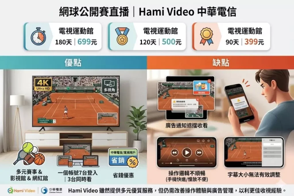 中華電信Hami video的優勢就是網網球公開賽直播外還有多元賽事種類,但是缺點也是比較明顯,大家最詬病的就是操作邏輯不順暢,手機裝置快進、慢放的都比較不方便,同時針對字幕的大也無法進行有效調整,再者就是廣告通知容易遮擋影響收看,這都是該平台的劣勢。