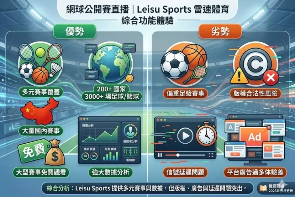 雷速體育(Leisu Sports)提供網球公開賽直播固然是好事,但是缺點也是比較明顯一點,這裡主要還是足球跟籃球賽事較為多元,然後版權賽事轉播的合法性風險、信號延遲以及平台廣告較多都是詬病,如果不是免費的話,相信大家不會想要來這裡觀看,畢竟問題太多了!