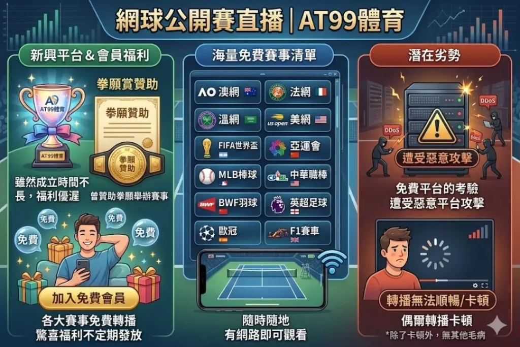 加入「AT99體育」會員不僅可以觀看到網球公開賽直播,包含澳網直播、溫網直播、法網直播、美網直播還有FIFA世界盃™足球賽、愛知名古屋亞運、MLB棒球、中華職棒、BWF羽球、英超足球、歐冠、F1賽車等等轉播都是免費看,只要你想的到的賽事基本上這裡都可以免費觀看,只要有網路就可以隨時隨地的觀看所有賽事。