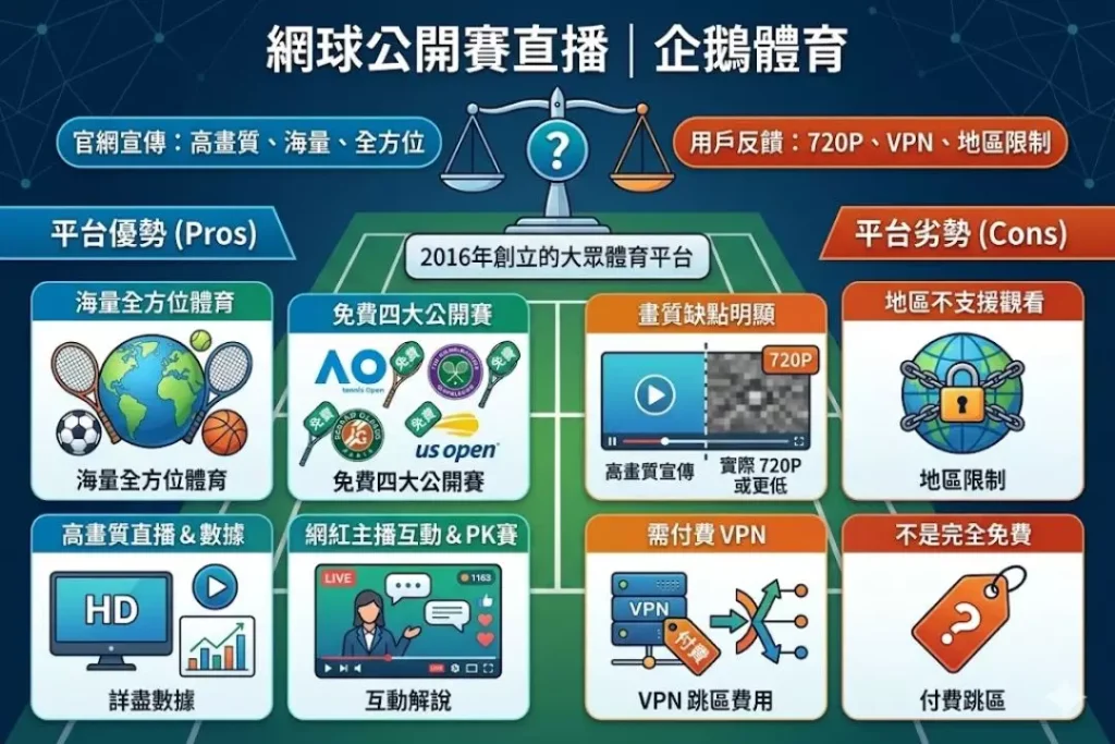 企鵝體育也會有提供網球公開賽直播讓大家免費觀看,企鵝體育於2016年聯合創立的專業網際網路體育平台,定位為「大眾體育」,提供海量體育賽事直播,這裡賽事的種類一樣多元,且擁有完整的體育生態,讓大家都可以有較多福利,但是真的是如此?還是只是官網的過譽?